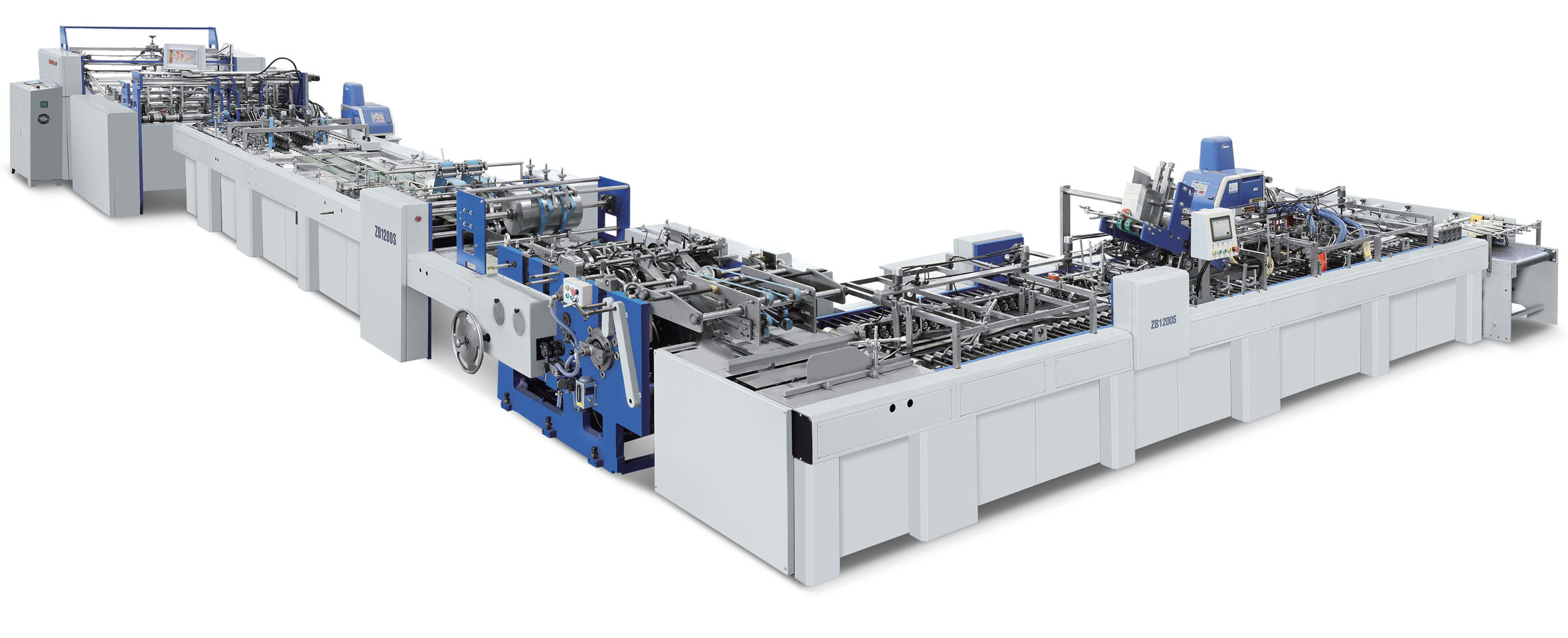 ZB1200S-430 Automatic paper bag making machine is ideal equipment for large batch paper bag produce. It adopts mechanical, electrical, optical and pneumatic technologies, combined with several patent technologies. After printing and die cutting/creasing, the machine automatically feeding sheets, register, top folding (or without top folding), tube forming, gusset forming, bottom folding and open, bottom cardboard insert(square bottom), gluing and compaction output. The machine take the advantages of new variable transmission technology, together with transverse and vertical creasing and bottom pulling systems to realize the traceless bag bottom closing. Thanks for the PLC and frequency control system, the machine can be operated by multi points and single remote control. With the advantages of high quality bag forming and high efficiency, the brand new ZB1200S-430 is leading equipment in the world.