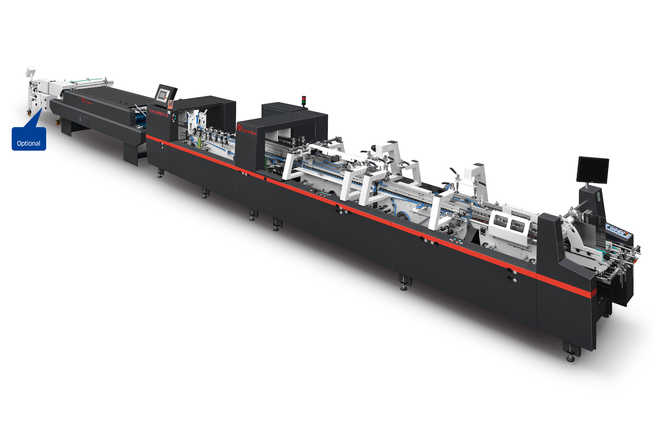5. Two sets of gluing units :top unit for bottom glue and lower unit for side glue. All standard glue units apply line glue. Space adjustment is through the tooth rods.